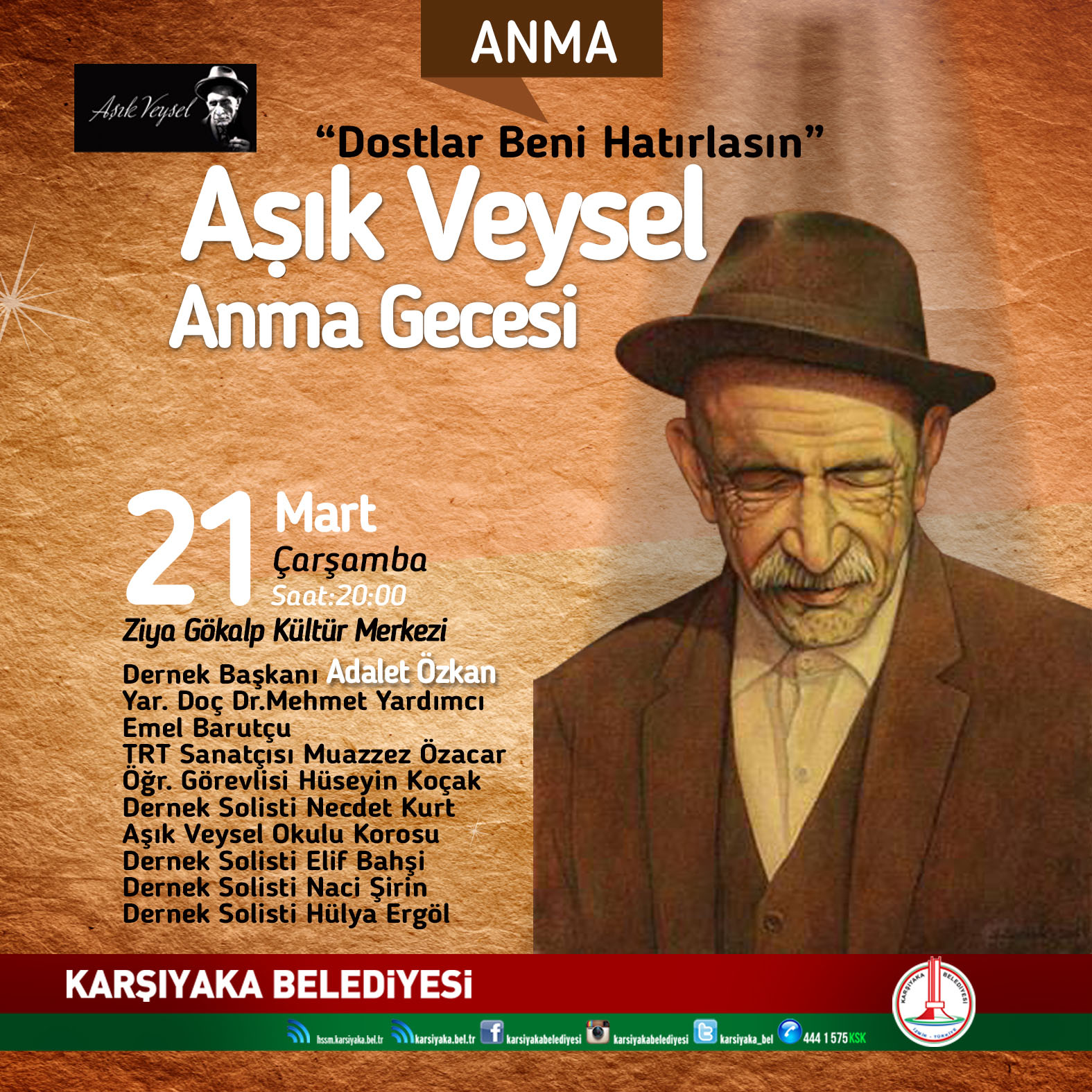 Karşıyaka Belediyesi ve Ege Bölgesi Aşık Veysel Kültür Derneği, “Uzun ince bir yoldayım, “Dostlar beni hatırlasın” ve “Kara toprak” gibi unutulmaz eserlerin sahibi Aşık Veysel Şatıroğlu anısına özel bir gece düzenleyecek. Ozanın 45. ölüm yıl dönümü, aynı zamanda da Dünya Şiir Günü olan 21 Mart’ta Ziya Gökalp Kültür Merkezi’nde yapılacak etkinlik, saat 20.00’da başlayacak.