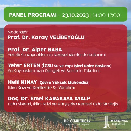 Prof. Dr. Koray Velibeyoğlu’nun moderatörlüğünde düzenlenecek panelde; Prof. Dr. Alper Baba ile 'Yeraltı Su Kaynaklarının Kentsel Alanlarda Kullanımı', İZSU Su ve Yapı İşleri Daire Başkanı Yeter Erten ile 'Su Kaynaklarımızın Dengeli Ve Sorumlu Tüketimi', Çevre Yüksek Mühendisi Helil Kınay ile 'İklim Krizi Ve Kentlerde Su Yönetimi', Doç. Dr. Emel Karakaya Ayalp ile 'Gıda Sistemi, İklim Krizi Ve Karşıyaka Kentsel Gıda Stratejisi' konuları ele alınacak.