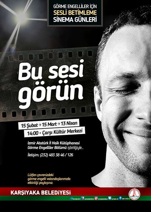 Karşıyaka Belediyesi, İzmir Atatürk İl Halk Kütüphanesi Görme Engelliler Bölümü ve Sesli Betimleme Derneği, “Bu sesi görün” sloganıyla, görme engelli bireylere kesintisiz sinema keyfi yaşatıyor. Dedemin İnsanları ile başlayan Sesli Betimleme Sinema Günleri’nde bu kez konukları dünya sinemasının klasikleşmiş yapıtlarından Ölü Ozanlar Derneği bekliyor. Çarşı Kültür Merkezi’nde 15 Mart Perşembe saat 14.00’te yapılacak gösterim için, (0232) 483 38 46 / 126 numaralı telefondan katılım talebi iletilebiliyor.