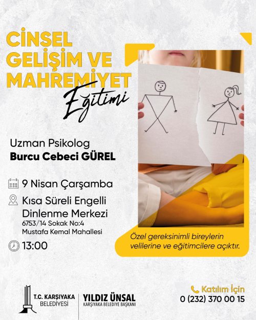 MEDYA EGE - Karşıyaka Belediyesi her alanda farkındalık yaratmak için eğitimlerini sürdürüyor. Bu kapsamda Karşıyaka Belediyesi, özel gereksinimli çocukların cinsel gelişim ve mahremiyet bilincini kazanmaları ve velilerin bilgilendirilmesi adına 'Cinsel Gelişim ve Mahremiyet' başlıklı eğitim düzenleyecek. Uzman Psikolog Burcu Cebeci Gürel’in katılımıyla, çocuklarda mahremiyet bilinci üzerine yapılacak buluşma, aileler ve eğitimciler için büyük bir fırsat sunuyor.