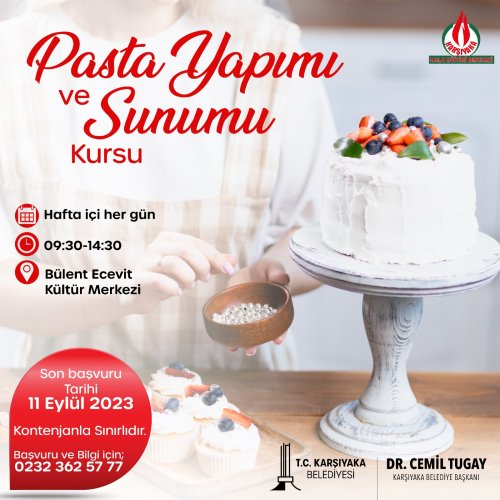 Karşıyaka Belediyesi'nin sosyal medya hesabından konuya ilişkin yapılan açıklamada; "Pasta Yapımı ve Sunumu Kursu Başlıyor! Bülent Ecevit Kültür Merkezi’nde hafta içi her gün 09.30 – 14.30 saatleri arasında sınırlı kontenjanla yapılacak kursumuza katılmak için 11 Eylül 2023 Cuma gününe kadar 0(232) 362 57 77 numaralı hattımızdan başvuru yapabilirsiniz" ifadelerine yer verildi.