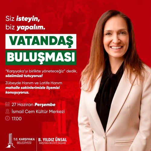 MEDYA EGE - Karşıyakalıların talep ve önerilerini ilk ağızdan dinlemek isteyen Karşıyaka Belediye Başkanı Yıldız Ünsal, 'Vatandaş Buluşmaları'nın üçüncüsünü, 27 Haziran Perşembe günü İsmail Cem Kültür Merkezi'nde gerçekleştirecek. Başkan Ünsal bu kapsamda, Zübeyde Hanım ve Latife Hanım mahalle sakinleriyle buluşarak talep ve önerileri dinleyecek.