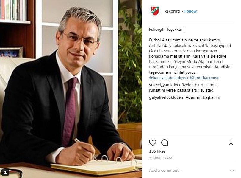 Kulübün sosyal medya hesabından yapılan paylaşımda Başkan Akpınar'a teşekkürler şu sözlerle iletildi: