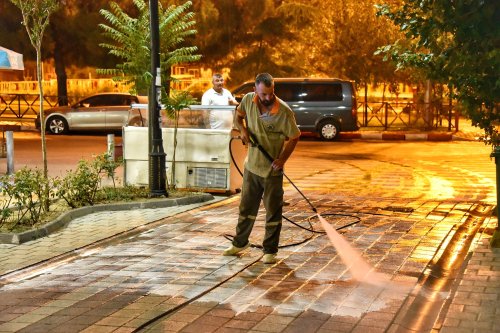 İnsan ve araç yoğunluğunun az olduğu gece saatlerinde yapılan detaylı temizlik çalışması 2 yıkama aracı, süpürme aracı ve 10 personel ile gerçekleştirildi.