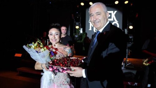 En iyi kiraz üreticilerine çapa makinası ve değişik ödüllerin verildiği gecede Başkan Mehmet Türkmen de, sanatçı Melek Mosso’ya bir tepsi kiraz takdim etmişti.