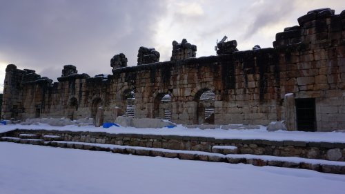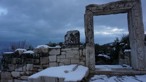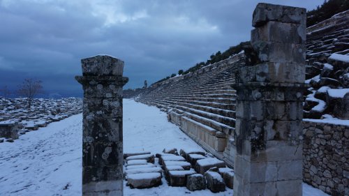 Tarihte gladyatörler şehri olarak bilinen Kibyra Antik Kenti, kar yağışı sonrası beyaz örtüye bürünerek ziyaretçilerin ilgisini topladı.