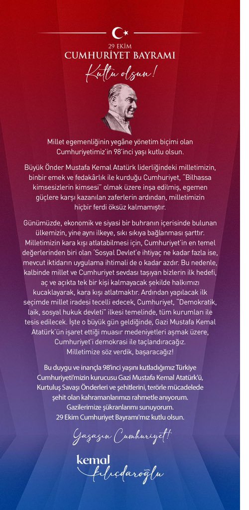 Bu duygu ve inançla 98'inci yaşını kutladığımız Türkiye Cumhuriyeti'mizin kurucusu Gazi Mustafa Kemal Atatürk'ü, Kurtuluş Savaş Önderleri ve şehitlerini, terörle mücadele şehit olan kaharamanlarımızı rahmet anıyorum. Gazilerimize şükranlarımı sunuyorum. 29 Ekim Cumhuriyet Bayramı'mız kutlu olsun.''