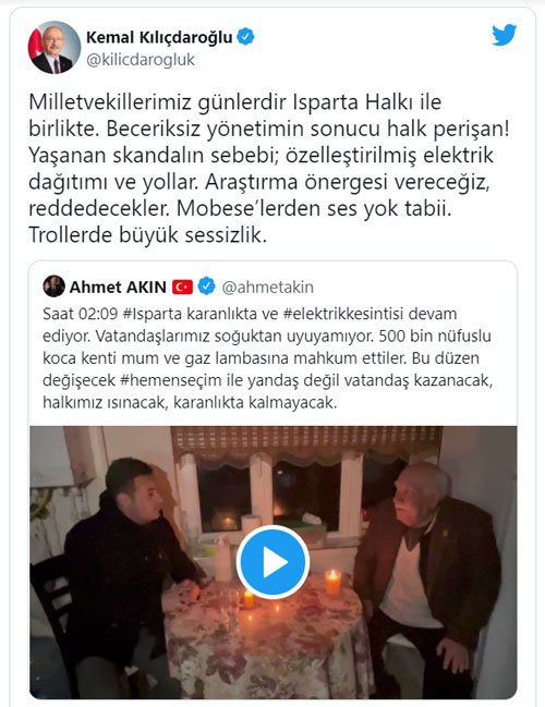 Cumhuriyet Halk Partisi (CHP) Lideri Kemal Kılıçdaroğlu, yoğun kar yağışının hayatı felç ettiği Isparta'da günlerdir yaşanan elektrik kesintisini eleştirdi. Ana muhalefet partisine mensup milletvekillerinin günlerdir Isparta halkı ile birlikte olduğunu belirten Kılıçdaroğlu, "Beceriksiz yönetimin sonucu halk perişan! Yaşanan skandalın sebebi; özelleştirilmiş elektrik dağıtımı ve yollar. Araştırma önergesi vereceğiz, reddedecekler" dedi.