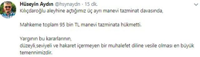 Cumhurbaşkanı Erdoğan'ın avukatlarından Hüseyin Aydın, sosyal medyadan yaptığı açıklamada "Kılıçdaroğlu aleyhine açtığımız üç ayrı manevi tazminat davasında,Mahkeme toplam 95 bin TL manevi tazminata hükmetti. Yargının bu kararlarının, düzeyli,seviyeli ve hakaret içermeyen bir muhalefet diline vesile olması en büyük temennimizdir." ifadelerini kullandı.