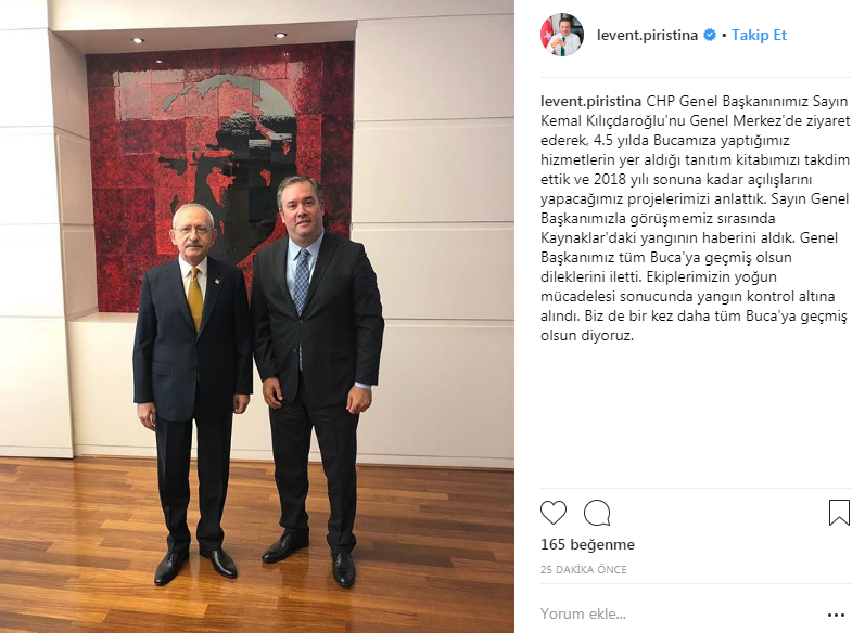 Buca Belediye Başkanı Levent Piriştina, Ankara'da CHP Genel Merkezi'nde Genel Başkan Kemal Kılıçdaroğlu ile görüştü. Başkan Piriştina, görev yaptığı 4,5 yıllık süre boyunca Buca'ya yaptığı hizmetlerin yer aldığı tanıtım kitabını Kılıçdaroğlu'na takdim ederek 2018 yılı sonuna kadar açılışlarını yapacakları projeleri anlattı.
