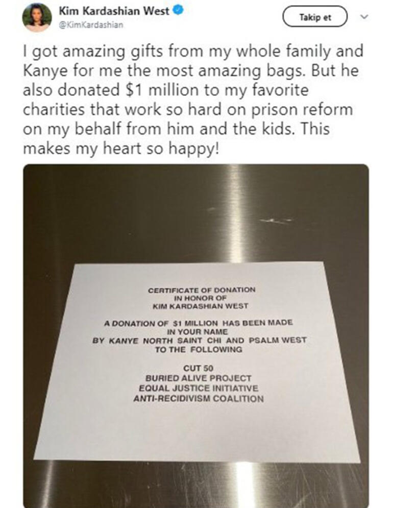 Twitter hesabından eşi West’in yaptığı bağışın sertifikasını takipçileriyle paylaşan Kardashian, eşinin bu inceliğinden dolayı çok mutlu olduğunu belirtti. Sertifikada bağış yapan isimler, Kanye West ile olan çocukları North, Saint, Chicago ve Psalm’ın isimleri de yer alıyor.