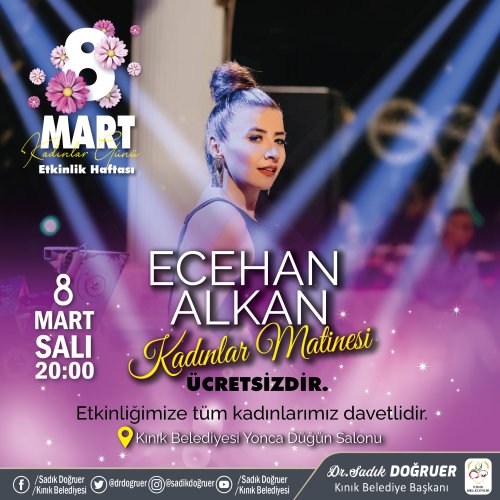 Etkinliğin son günü Kınık Belediyesi Delez Yaşam Vadisi Sosyal Tesislerinde, 8 Mart Salı günü köy kadınları kahvaltı programı ile başlayıp Kınık Belediyesi Yonca düğün Salonunda sanatçı Ecehan Alkan eşliğinde kadınlar matinesi ardından etkinlik haftası son bulacak.