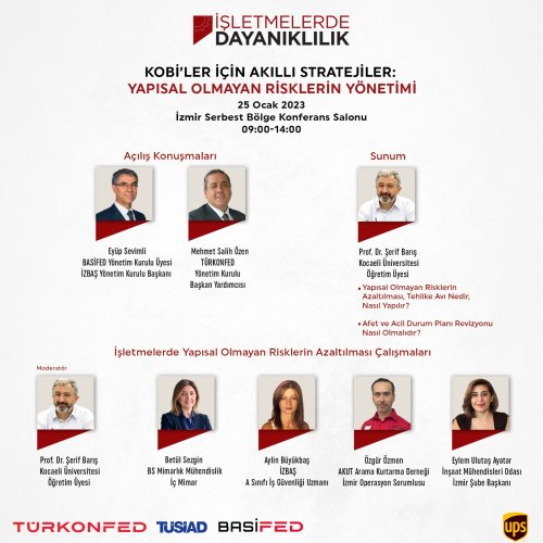 KOBİ’lerin deprem dayanıklılığını arttırmak amacı ile gerçekleştirilecek panelin açılış konuşmalarını TÜRKONFED Yönetim Kurulu Başkan Yardımcısı Mehmet Salih Özen ve BASİFED Yönetim Kurulu Üyesi, İZBAŞ Yönetim Kurulu Başkanı Eyüp Sevimli’nin gerçekleştireceği eğitimde Kocaeli Üniversitesi Öğretim Üyesi Prof. Şerif Barış, “Yapısal Olmayan Risklerin Azaltılması, Tehlike Avı Nedir, Nasıl Yapılır? ve “Afet ve Acil Durum Planı Revizyonu Nasıl Olmalıdır?” başlıklı sunumları gerçekleştirecek.