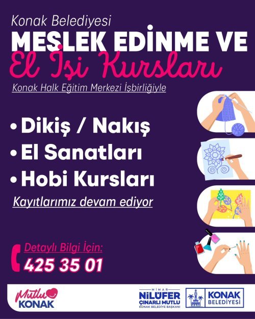 MEDYA EGE - Konak Belediyesi her yaştan vatandaşın sosyal ve kültürel yaşama aktif olarak katılması, kendini geliştirmesi ve istihdam edilmesi için çeşitli etkinlik ve çalışmalarını sürdürüyor. Bu kapsamda Konak Belediyesi ve Konak Halk Eğitim Merkezi işbirliğinde hayata geçirilen Meslek Edindirme ve El İşi Kursları'na kayıtlar devam ediyor.