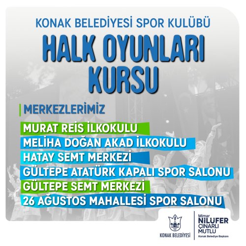 “Konak Belediyesi Spor Kulübü Halk Oyunları kurslarımızda 7’den 70’e tüm komşularımızı geleneksel halk oyunlarımızın coşkusunu birlikte yaşamaya davet ediyoruz. Siz de halk oyunlarına meraklıysanız Konak'ımızın 6 farklı noktasında gerçekleştirilecek kurslarımıza kayıt yaptırmakta gecikmeyin. Detaylı bilgi için mesai saatleri içerisinde 0232 482 10 39 numaralı telefondan bize ulaşabilirsiniz.”