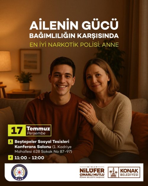 Konak Belediyesi ve İl Emniyet Müdürlüğü iş birliğiyle 17 Temmuz’da “Madde Bağımlılığıyla Mücadele Farkındalık Eğitimi” düzenleniyor. Aileler, madde bağımlılığının erken belirtileri ve korunma yolları hakkında bilgilendirilecek.