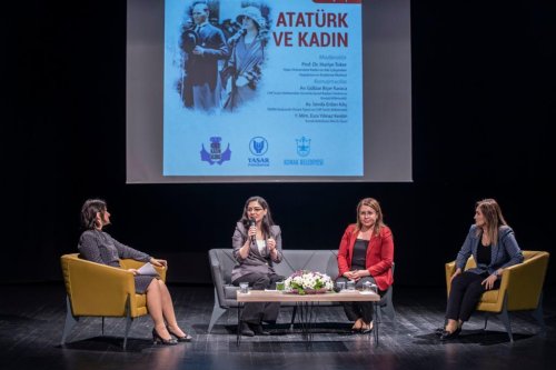 Konak Belediyesi, 5 Aralık Kadın Hakları Günü ve Türk Kadınına Seçme ve Seçilme Hakkı Tanınmasının yıldönümü etkinlikleri kapsamında Ege Kadın Buluşması Platformu ve Yaşar Üniversitesi işbirliğinde, “Atatürk ve Kadın” söyleşisi düzenledi. Selahattin Akçiçek Kültür Merkezi’nde gerçekleştirilen etkinliğe Konak Belediye Başkanı Abdül Batur’la birlikte söyleşinin konukları CHP İnsan Haklarından Sorumlu Genel Başkan Yardımcısı ve Denizli Milletvekili Avukat Gülizar Biçer Karaca, TBMM Başkanlık Divanı Katip Üyesi ve CHP İzmir Milletvekili Avukat Sevda Erdan Kılıç, Konak Belediye Meclis Üyesi Yüksek Mimar Esra Yılmaz Keskin, söyleşinin moderatörü Yaşar Üniversitesi Kadın ve Aile Çalışmaları Uygulama ve Araştırma Merkezi (YÜKAM) Müdürü Prof. Dr. Huriye Toker, CHP Kadın Kolları MYK Üyesi Ayten Gülsever, CHP Konak İlçe Başkanı Akın Küçükoğullarından, CHP İzmir İl ve Konak İlçe yöneticileri, İzmir İl ve Konak İlçe Kadın ve Gençlik Kolları başkan ve üyeleri, Konak Belediyesi Meclis Üyeleri, kadın sivil toplum kuruluşları başkan ve temsilcileri ile muhtarlar katıldı. Söyleşiyi izleyen kadınlar, konuşmacıları ayakta alkışladı.