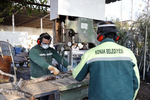 Konak Belediyesi Park ve Bahçeler Müdürlüğü ekipleri, ağaç budama sonrasında çıkan atıkları çöpe değil sobaya hazırlıyor.