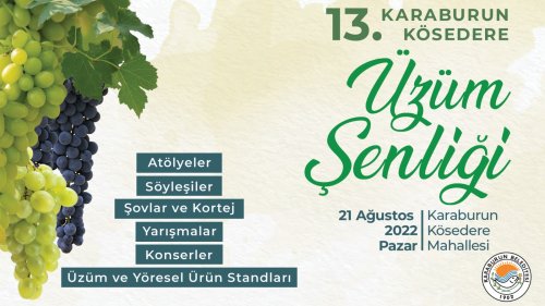 Medya Ege- İzmir'in Karaburun ilçesi ile özdeşleşen geleneksel Karaburun Kösedere Üzüm Şenliği, bu yıl, 21 Ağustos Pazar Günü Karaburun Kösedere Mahallesi’nde gerçekleşecek. 13'üncü kez düzenlenecek olan Karaburun Kösedere Üzüm Şenliği, çeşitli atölyeler, söyleşiler, şovlar, kortej yürüyüşleri, yarışma ve konserlerle dolu dolu geçecek.