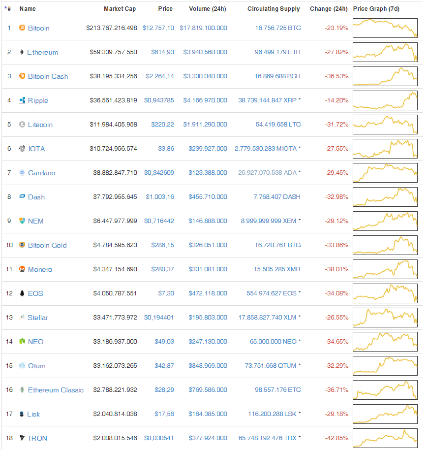 Tek düşüş Bitcoin'de yaşanmadı. Kripto paraların çoğunda bir düşüş gözleniyor. Öyle ki, bir hafta önce piyasa değeri 650 milyar dolar olan kripto para borsasının düşüşten sonraki değeri 450 milyar dolar oldu.