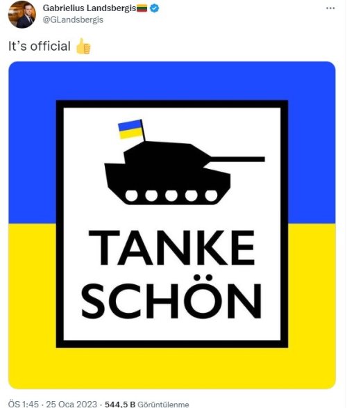Almanya’nın Ukrayna’ya Leopard 2 tanklarını gönderme kararı ve diğer ülkelere de envanterlerindeki Leopard tanklarını Ukrayna’ya yollayabilmeleri için yeşil ışık yakması Avrupa ülkelerinde memnuniyetle karşılandı. Litvanya Dışişleri Bakanı Gabrielius Landsbergis resmi Twitter hesabından yaptığı paylaşımda Berlin yönetimine Almanca "Çok teşekkürler" anlamına gelen "Danke schön" ifadesine gönderme yaparak teşekkür etti. Bakan Landsbergis, üzerinde Ukrayna bayrağı olan bir tank resmi paylaşarak "Tanke schön" ifadesini kullandı.