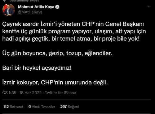 Sosyal medya hesabından açıklamada bulunan Mahmut Atilla Kaya, “Çeyrek asırdır İzmir'i yöneten CHP'nin Genel Başkanı kentte üç günlük program yapıyor, ulaşım, alt yapı için hadi açılışı geçtik, bir temel atma, bir proje bile yok! Üç gün boyunca, gezip, tozup, eğlendiler. Bari bir heykel açsaydınız! İzmir kokuyor, CHP'nin umurunda değil" ifadelerini kullandı.