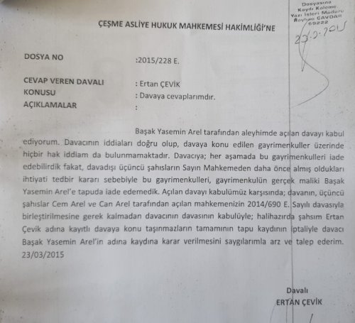 Özetle der ki, “Ben önce Yalçın S. ardından din adamı Ertan Çevik’e malları verdim. Malları geri vermeleri için sözleşme yapalım istedim. Yalçın S. imzaladı, ancak babamın 20 yıllık arkadaşı olan Ertan Çevik buna yanaşmadı. Bu yüzden tapuların iptalini, malların bana iade edilmesini talep ediyorum.”