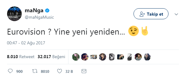 Daha önce 2010 yılında ülkemizi Almanya’da düzenlenen Eurovision Şarkı Yarışması’nda başarıyla temsil etmiş ve yarışmadan ikincilik derecesiyle ayrılarak bizi gururlandırmış maNga grubu, resmi Twitter hesabından mutluluk verici bir paylaşımda bulundu.