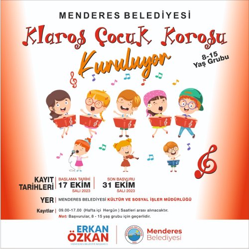 Kültür sanat etkinliklerine önem verdiklerini ifade eden Menderes Belediye Başkanı Erkan Özkan, ‘’ Menderes Belediyesi olarak kültür sanat çalışmalarımıza yoğun şekilde devam ediyoruz. Bu kapsamda gerçekleştirdiğimiz çalışmalarımızda her yaş grubuna hitap eden hizmetlerimizi vatandaşlarımıza sunuyoruz. Kayıt sürecini başlattığımız Klaros Çocuk Korosuyla da 8-15 yaş arasında ki çocuklarımızı müzikle buluşturmayı hedefledik. Tüm çocuklarımızı koromuza başvurmaya davet ediyorum’’ dedi.