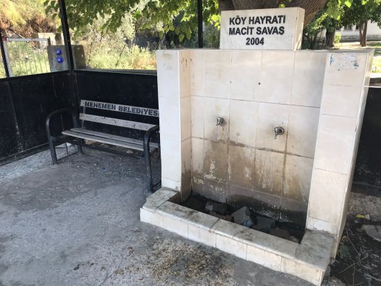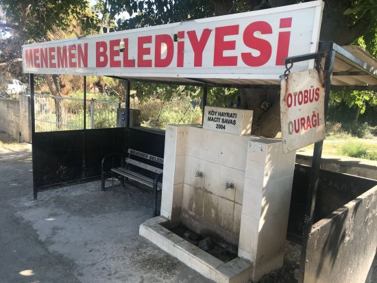 Menemen Belediyesi’ni tarihe geçiren otobüs durağı değil, otobüs durağının içinde, hayır için yapılan çeşme oldu. Belediye görevlileri, bir vatandaş tarafından yapılan mermer hayır çeşmesinin, sağına, soluna değil, çeşme tam ortasında kalacak şekilde otobüs durağı yaptı. Otobüs durağını yapan Belediye, vatandaşların hayır için yaptırdıkları hayratın üstünün ve yanlarının kapatılması şaşkınlık yarattı.. Çeşmeli otobüs durağının yapan Menemen Belediye Başkanı Tahir Şahin, belediyelerin hizmet ve çalışma örneklerinin en ilgincini vererek, belediyecilik tarihine geçti. Vatandaşları şaşkın bakışlarına neden olan çeşmeli otobüs durağına gelen vatandaşlar, çeşmenin başında otobüsün gelmesini bekliyorlar.