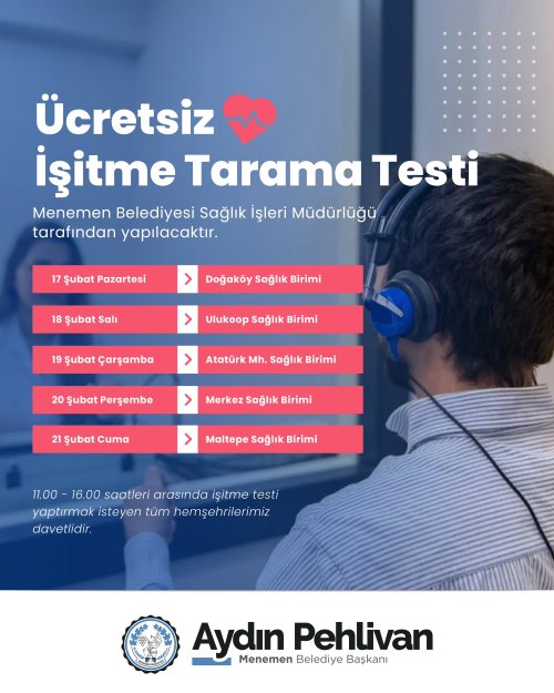 MEDYA EGE - Menemen Belediyesi, vatandaşlarının sağlığını ön planda tutarak önemli bir adım attı. Bu kapsamda Menemen Belediyesi Sağlık İşleri Müdürlüğü'nün organize ettiği ücretsiz işitme tarama testi ile, çeşitli mahallerde yaşayan vatandaşlara sağlık hizmeti sunulacak. Sunulan by hizmet ile, işitme sağlığı konusunda farkındalık yaratmak ve olası sorunların erken teşhisini sağlamak amaçlanırken, İşitme Tarama Testleri, 17-21 Şubat tarihleri arasında gerçekleştirilecek.