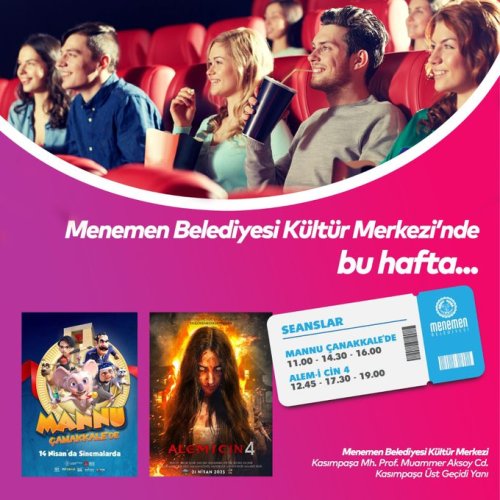 Menemen Belediyesi sosyal medya hesabından paylaşım yaparak Menemen Belediyesi Kültür Merkezi Sineması'nda haftanın seanslarını duyurdu. Yapılan paylaşıma göre 28 Nisan-4 Mayıs tarihleri arasında hafta boyunca gösterilecek filmler şu şekilde: