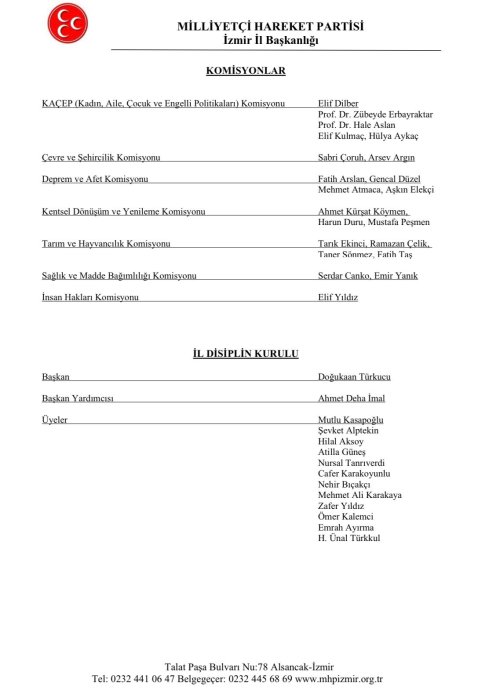 Milliyetçi Hareket Partisi İzmir İl Başkanlığı, yeni başkanlık divanını açıkladı.