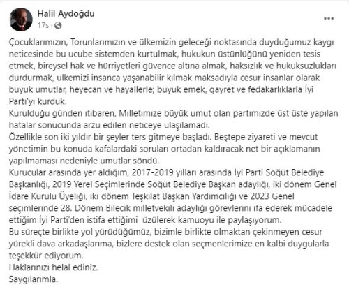 İYİ Parti’den Söğüt Belediye Başkanlığı ve Genel İdare Kurulu üyeliği görevlerinde bulunan Halil Aydoğdu, İYİ Parti’den istifa ettiğini duyurdu.