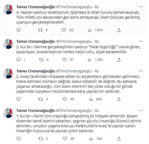 MHP İzmir eski Milletvekili Tamer Osmanağaoğlu; İsveç'te bir camii önünde Kur'an yakılmasına ilişkin, "Kur’an-ı Kerime gerçekleştirilen saldırıyı “ifade özgürlüğü” olarak gören, pazarlayan, sıradanlaştıran herkes habis ruhlu, alçak karakterlidir" dedi.
