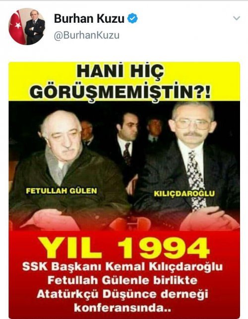 CHP İstanbul Milletvekili ve Anayasa Profesörü Burhan Kuzu, FETÖ lideri Gülen'in Erdoğan ile olan fotoğrafının, Erdoğan’ın yerine Kılıçdaroğlu montajlanmış halini paylaşmasına savunma yaptı.