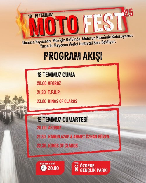 Menderes Belediyesi'nin desteklediği Moto Fest, 18-19 Temmuz’da Özdere Gençlik Parkı’nda düzenleniyor. Ücretsiz konserlerle dolu iki gün boyunca Aforoz, T.F.R.P., Kings of Claros ve Kanun Azap sahne alacak.