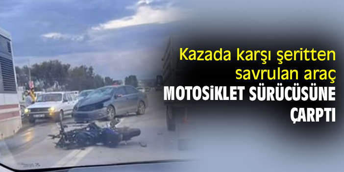 Kazada karşı şeritten savrulan araç motosiklet sürücüsüne çarptı