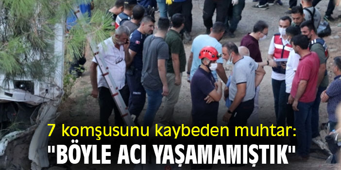 İzmir’in Bergama ve Kınık ilçesinden Kemalpaşa ilçesindeki Hamza Baba Türbesi'ni ziyarete gidenleri taşıyan minibüsün dönüş yolunda uçuruma yuvarlanması sonucu mahallesinden 7 kişinin vefat ettiğini söyleyen muhtar Erdem Nuray, böyle ağır bir acı yaşamadıklarını söyledi.