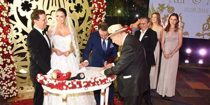 50 bin adet kırmızı gülün kullanıldığı peri masallarını andıran düğün töreninde Türk Bayrağı ve Lübnan Bayrağı dikkatlerden kaçmadı.