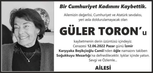 Cumhuriyet Halk Partisi (CHP) önceki dönem İzmir Milletvekili Musa Çam, ‘Ablamız, annemiz’ dediği Güler Arıman Toron’un vefat haberini sosyal medyada paylaştı. Çam paylaşımında, “1950 Türkiye güzeli, 1978/1980 CHP İzmir merkez İlçe Kadın Kolu Başkanımız, ablamız, annemiz Güler Arıman Toron’u kaybettik. Acımız büyük. 12 Haziran 2022 Pazar günü öğle namazında Karşıyaka Beşikçioğlu Camiinde sonsuzluğa uğurlayacağız. Yıldızlar yoldaşın olsun. Saygı ve özlemle” ifadelerine yer verdi. Çam, "Ülkemize sunduğu hizmetlerden ve Cumhuriyet Halk Partisi’ne katkılarından ve emeklerinden dolayı Güler Arıman Toron'a minnet ve şükranlarımızı sunuyoruz" dedi.