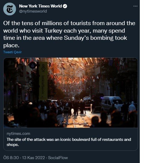 NYT’nin söz konusu paylaşımında, “Her yıl dünyanın dört bir yanından Türkiye'yi ziyaret eden on milyonlarca turistin çoğu, Pazar günkü bombalamanın gerçekleştiği bölgede vakit geçiriyor” denildi.