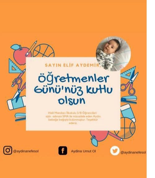 Manisa Akhisar Halil Mandacı İlköğretim okulu 3B sınıfı öğrencileri sınıf öğretmeni Elif Aydemir'in 24 Kasım Öğretmenler Gününü farkındalık yaratmak adına güzel bir şekilde kutladı. Öğrenci velileri aralarında para toplayarak SMA hastası Aydın Tanrıverdi'ye (@aydınanefesol) Elif Aydemir adına bağış yaptı. Küçük meleğe hayat vermek, ona sağlığını bağışlamak dünyadaki en büyük hediyedir diyen veliler bu bağıştan ve kutlamadan çok mutlu olduklarını belirttiler.