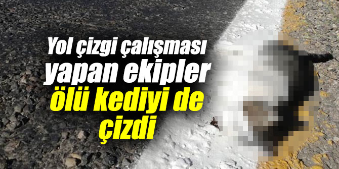 Yol çizgi çalışması yapan ekipler ölü kedinin üstünü de çizdi
