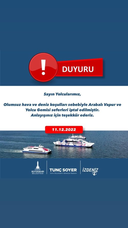 İzmir’de olumsuz hava ve deniz koşulları nedeniyle tüm vapur seferlerin iptal edildiği açıklandı. İZDENİZ tarafından yapılan açıklamada, "Olumsuz hava ve deniz koşulları sebebiyle araba vapur ve yolcu gemisi seferleri iptal edilmiştir. Anlayışınız için teşekkür ederiz" ifadelerine yer verildi.