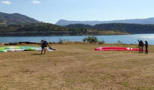 Yamaç paraşütü tutkunlarının baraj gölü üzerinde yaptıkları uçuşlar sırasında güvenlik amacıyla bir tekne de gölde hazır bulundu.