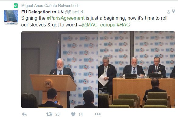 Paris Anlaşması'nın imzalanmasının ardından Avrupa Birliği Enerji ve İklim Komiseri Miguel Arias Canete, anlaşmanın sadece başlangıç olduğunu zamanın kolları sıvama ve çalışma zamanı olduğunu söyledi.