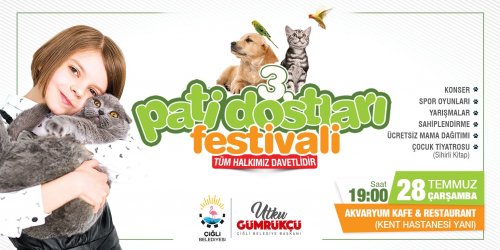 Sokak hayvanları için yaptığı çalışmalarla adından sıkça söz ettiren Çiğli Belediyesi 3. Pati Dostları Festivali'ne hazırlanıyor. Akvaryum Kafe'de gerçekleşecek festivalde patili dostlar ve hayvanseverler bir araya gelecek ve spor oyunları, çocuk tiyatrosu gibi birçok aktivite yapılacak.