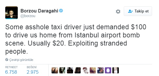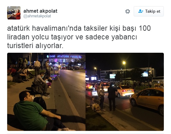 İstanbul Atatürk Havalimanı'nda meydana gelen silahlı ve bombalı saldırısı sonrası taksicilerin havaalanından uzaklaşmak isteyen yolculardan fahiş ücretler talep ettiği iddia edildi.