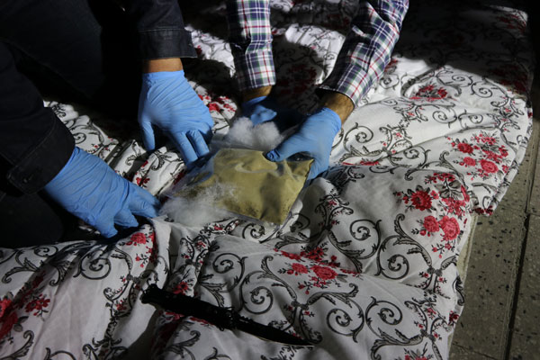 Narkotik köpeklerinin de kullanıldığı aramada polis ekipleri yere serdiği yorganlarda elle yaptıkları kontrolde içlerinde paketler olduğunu fark etti. Ardından bıçakla kesilen yorganların belli bölümlerinde düzenli bir şekilde özel poşetlerle yerleştirilmiş saf eroinler bulundu. Kaçakçıların uyuşturucu paketlerini yerleştirdikleri yorganlarda denge unsurunu dahi gözettikleri ve paketleri yorganların denge noktalarına yerleştirdikleri öğrenildi. Polis kamyonet kasasındaki 100 yorganı tek tek indirerek yaptıkları kontrolde 80 yorganın içerisinde 250 gramlık paketler halinde yerleştirilmiş 80 adet eroin poşeti buldu.